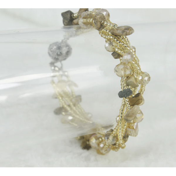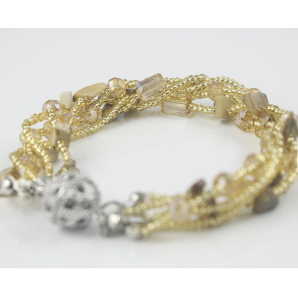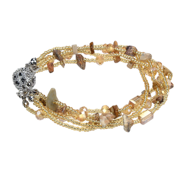 - 5 strands of iridescent champagne color crystals, gold seed beeds, and natural polished stones blend to create this exquisite bracelet. Magnetic silver and rhinestone closure