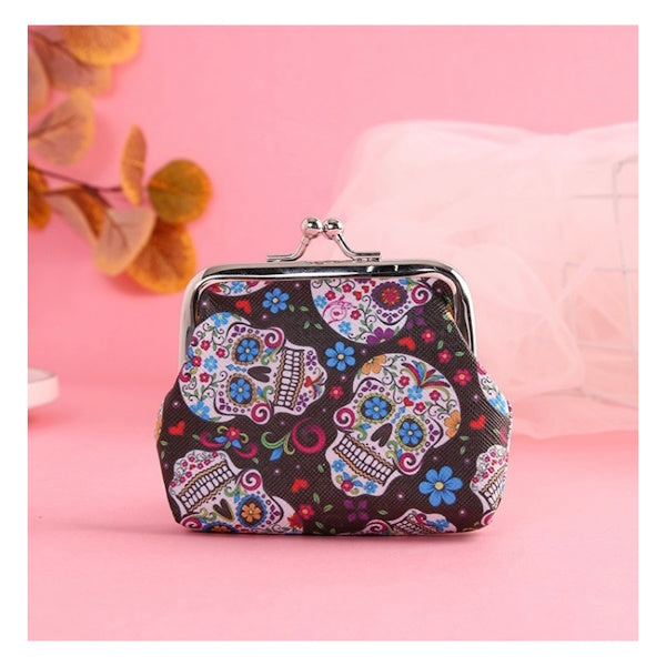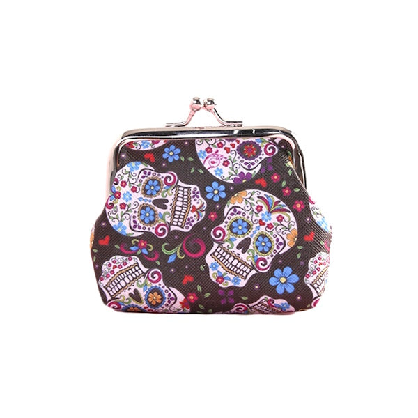 - Black background, colorful sugar skulls-blue, white, red, green, orange, pink and purple with silver color clasp