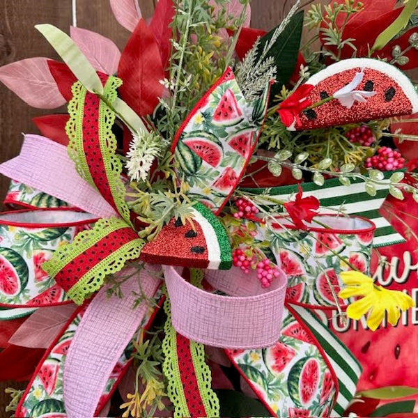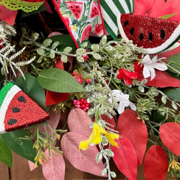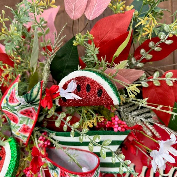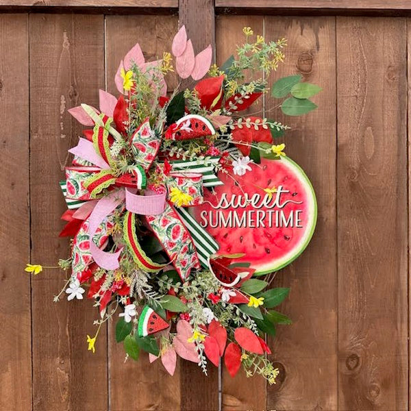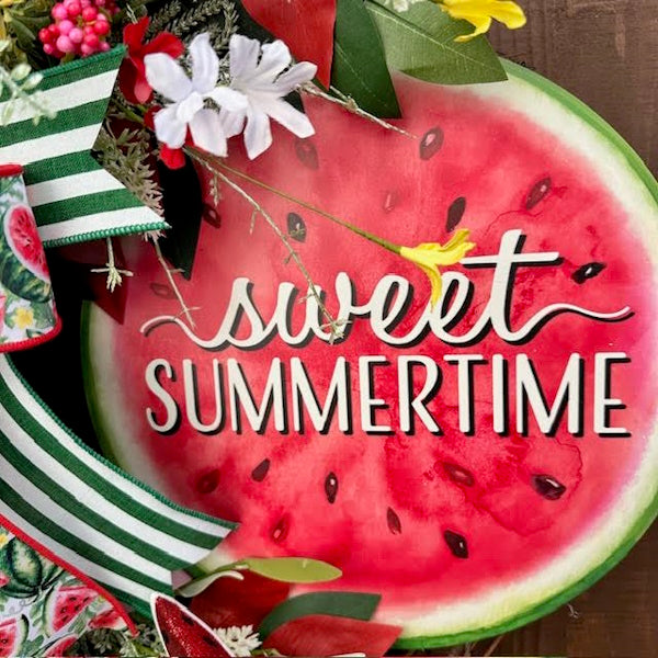 Welcome summer with a splash of fun! This Sweet Summertime Watermelon Wreath brings juicy vibes to your door with its adorable metal watermelon sign. Lovingly handcrafted on a grapevine base, we've jazzed it up with cheerful florals, bouncy greenery, and perky handmade bows that practically dance with delight. It's the perfect way to say "Hey there, sunshine!" to everyone who visits!