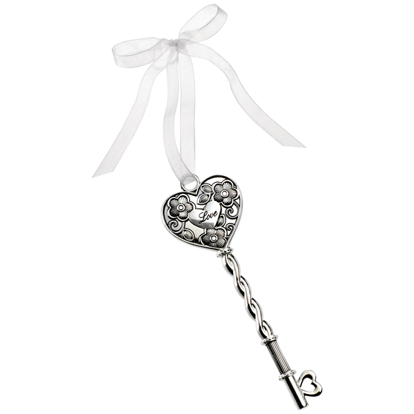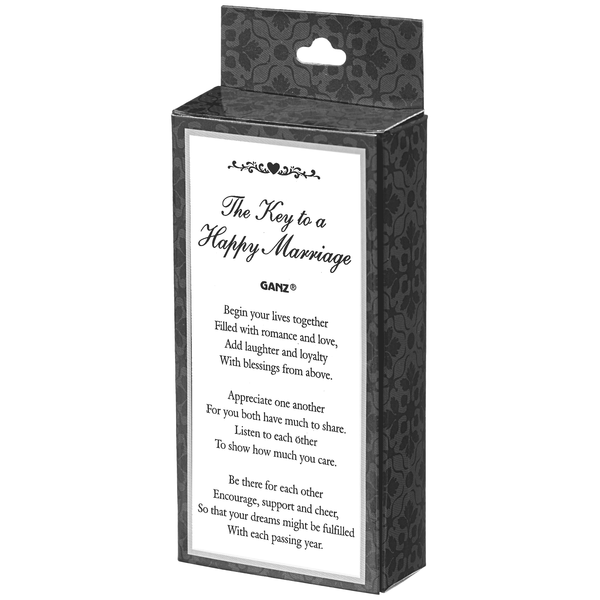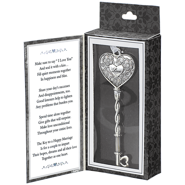 - The timeless silver key ornament comes boxed with the text "Begin your lives together filled with romance and love, add laughter and loyalty with blessings from above. Appreciate one another for you both have much to share. Listen to each other to show how much you care. Be there for each other encourage, support and cheer, so that your dreams might be fulfilled with each passing year. Make sure to say "I Love You" And seal it with a kiss... Fill quiet moments together in happiness and bliss. Share your day's successes and disappointments, too. Good listeners help to lighten any problems that burden you. Spend time alone together give gifts that will surprise. Make love unconditional throughout your entire lives. The key to a Happy Marriage is for a couple to impart their hopes, dreams and all their love together as one heart." printed on the inside and outside.