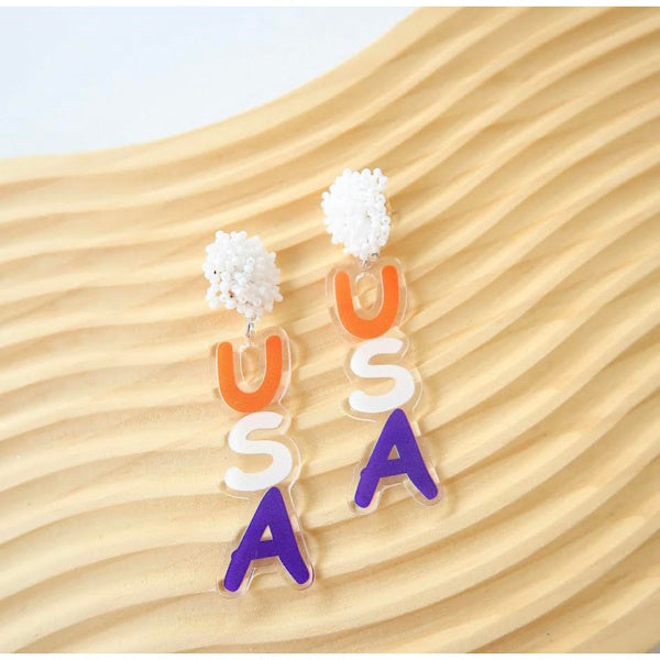 Celebrate your patriotic pride with these playful USA Acrylic Earrings, featuring a white beaded top and spirited red, white, and blue lettering. Lightweight and easy to wear, they bring a fun and festive flair to any look, perfect for summer celebrations or everyday sparkle.