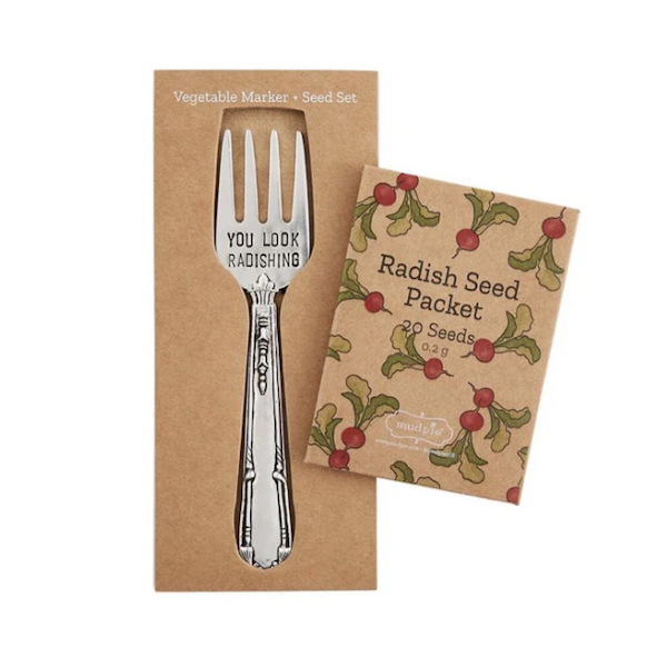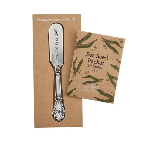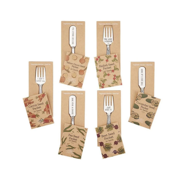 - Our veggie marker and seed set comes as a 2-piece gift set. Each set contains a humorous stamped silverplate utensil garden marker with a printed kraft paper vegetable seed packet.