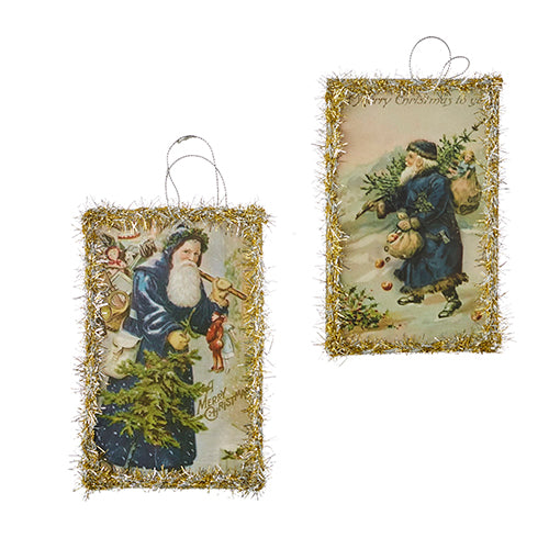 - Trimmed in tinsel our Vintage Santa Postcard Ornament is sure to be a treasure! Old fashioned looking Santa Claus wearing a navy blue suit is captured in snowy scenes. Lightweight and sparkly, 2 classic styles to choose from, each sold seperately.