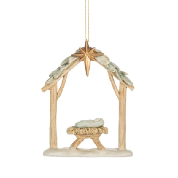 - Artist Licensor Lori Siebert beautifully created this ornament that you will treasure. Soft pastel colors, light white wash wood effects and the glistening pale gold star over the manger are some of the unique simple highlights of this holiday ornament that you will love.