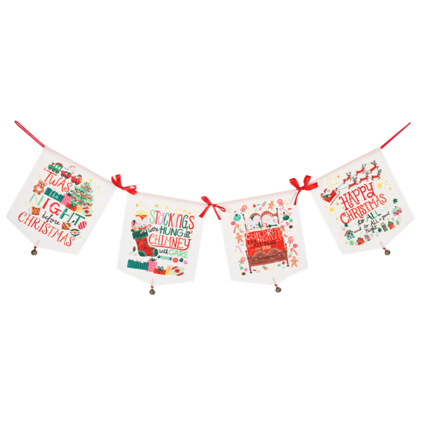 - Printed fabric garland with whimsical scenes from the classic Christmas story in the banner panels: 'Twas the Night Before Christmas, Stockings were Hung by the Chimney with Care, Children were Nestled All Snug in Their Beds and Happy Christmas to All and to All a Good Night. Attached with red string and bows, and gold jingle bells at bottom of each panel.