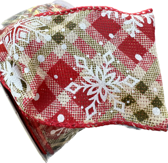 White Snowflake Red and Green Plaid Double Wire-Edged Ribbon