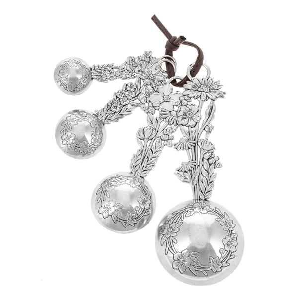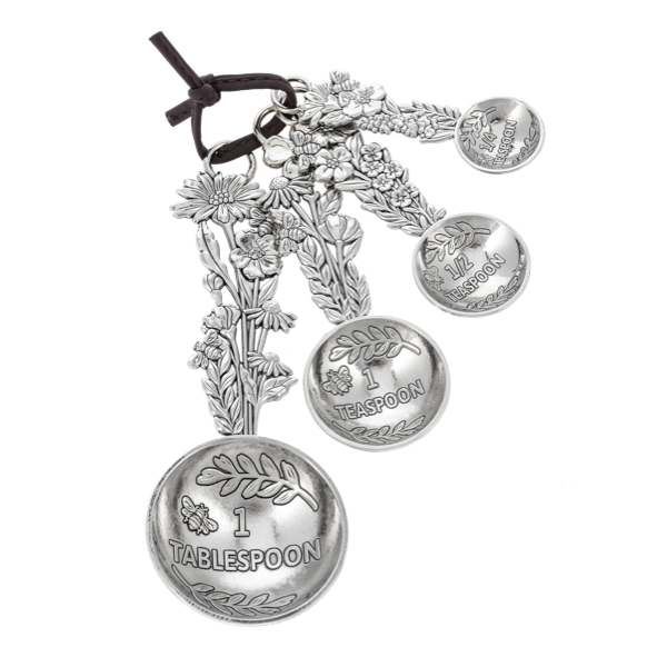 - Includes 1 ea. of 1 tbsp., 1 tsp., 1/2 tsp., 1/4 tsp. Different designs on front and backside with lots of intricate details, all spoons knotted together with a dark brown faux leather tie
