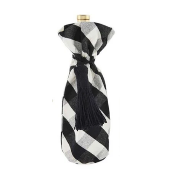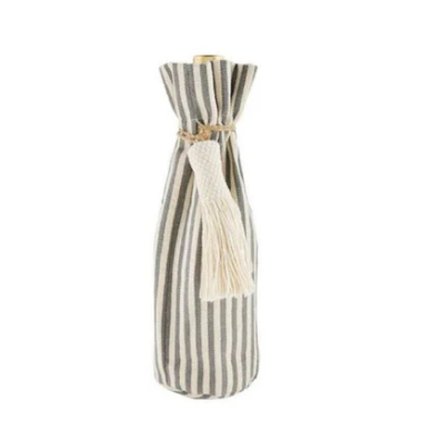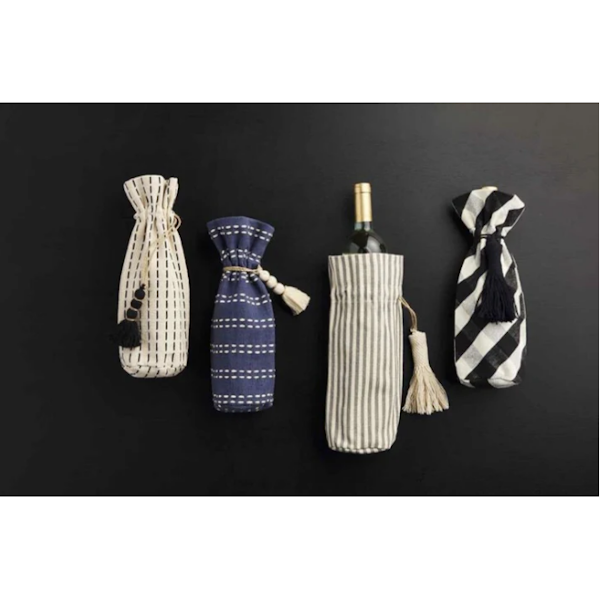 - Wrap up that delicious bottle of wine (or olive oil?) with one of our fabulous statement wine bottle bags. Each one is made from heavy duty decorative canvas and cinched with a nice, thick, chunky cotton tassel. Choose from the Blue Cream Stitch, Black Cream Buffalo Check, Grey Cream Stripe or the Cream Black Dash bottle bags, each sold seperately.
