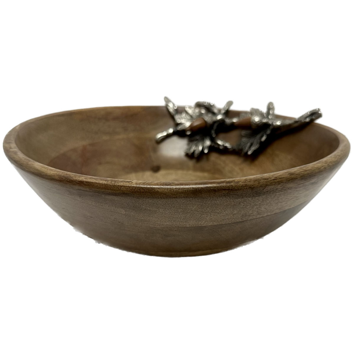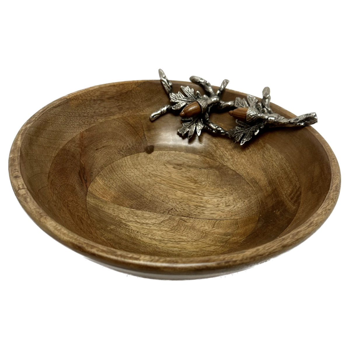 Crafted from beautiful mango wood and accented with metal leaves and wooden acorns, our Wood Acorn Salad Bowl adds an elegant touch to any dining experience. Its natural, rustic design enhances the overall aesthetic of your table setting, while its durable construction ensures long-lasting use. Elevate your salads to a new level with this sophisticated bowl.