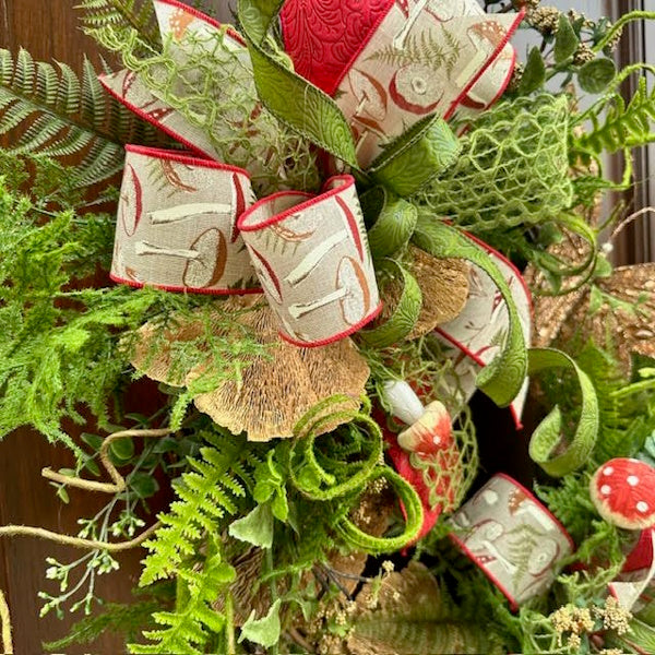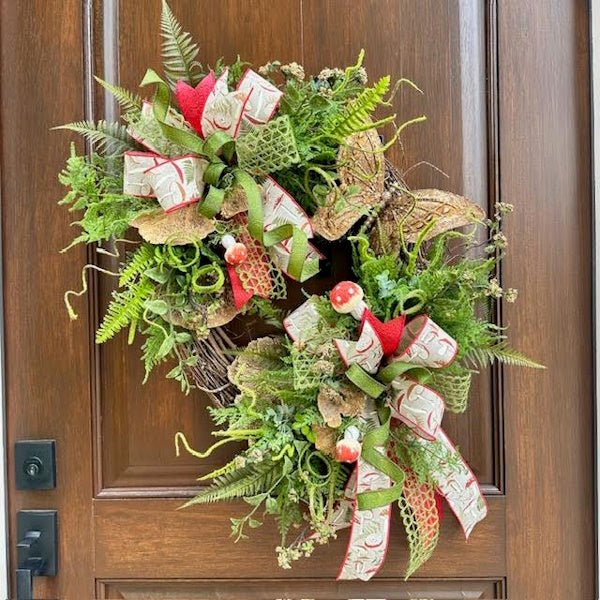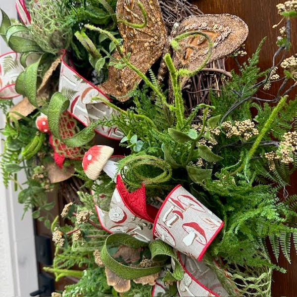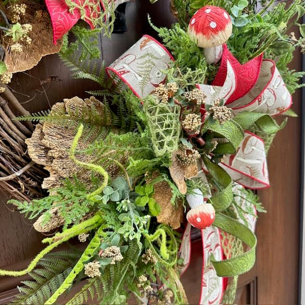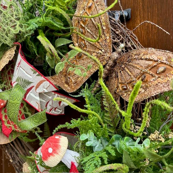 Bring a touch of woodland whimsy to your home with this handmade wreath. Crafted on a natural grapevine base, it features real sponge mushrooms, soft flocked moss greenery, and a sparkling brown autumn butterfly. Perfect for everyday charm and especially delightful during fall, this wreath adds a playful, nature-inspired accent to any door or wall.